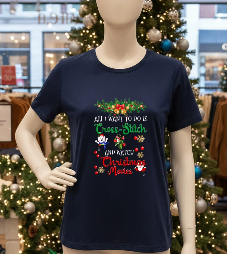 Just last week, while scrolling, I saw a clip of Sarah Jessica Parker – queen of New York style, right? – talking about how, amidst Fashion Week glamour, sometimes you just crave genuine, cozy comfort. She championed a ‘quiet luxury’ of personal joy. That feeling perfectly clicked with the All I Want To Do Is Cross Stitch And Watch Christmas Movies Shirt. This isn’t for a Chelsea Piers runway; it’s for the after-party of your own life. Imagine: a chilly Lower East Side evening. The city outside is a symphony of sirens. I’ve battled deadlines, navigated rush hour, feeling the pressure of every ‘must-have’ fall fashion trend screaming from Fifth Avenue, thinking about the latest sustainable fashion discussions or the retro streetwear hitting Bushwick. All I want is to hit reset. Kicking off boots, peeling off work clothes, I immediately reach for this shirt. It’s not about making a statement to the world; it’s making one to myself. My uniform for unwinding, my personal rebellion against constant ‘on.’ This T-shirt isn’t just fabric; it’s an invitation to a mood. It’s for those evenings when the only ‘event’ is a date with your couch, a good craft project, and a double feature of holiday classics. It’s the perfect antidote to high-octane NYC, reminding you the most fashionable thing can be pure comfort.