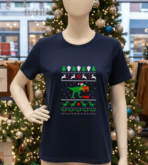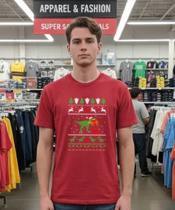 Let’s zoom in on that magnificent graphic. It’s not just a quick print; there’s a playful artistry to it, almost like a scene ripped from a classic holiday movie but with a prehistoric twist. The T-Rex, usually a symbol of raw power, is transformed into a comically mischievous holiday icon, mid-chomp, with the reindeer looking… well, appropriately startled! This design isn’t just funny; it’s a stroke of genius, turning heads and sparking smiles. When you wear this shirt, you’re not just wearing fabric; you’re wearing a mood. You’re signaling that you don’t take life too seriously, that you appreciate a good laugh, and that you’re probably the most fun person in the room. It evokes a sense of lighthearted rebellion, a quiet confidence that says, “Yeah, I wore a dinosaur eating a reindeer, what of it?” To keep that vibrant graphic looking fresh, a simple cold wash inside out and tumble dry low is all it needs. It’s a shirt designed not just to be worn, but to become a beloved part of your festive traditions, a piece that brings joy year after year, just like that favorite ornament you pull out every December.